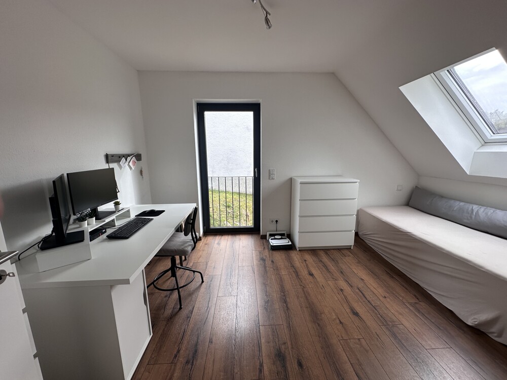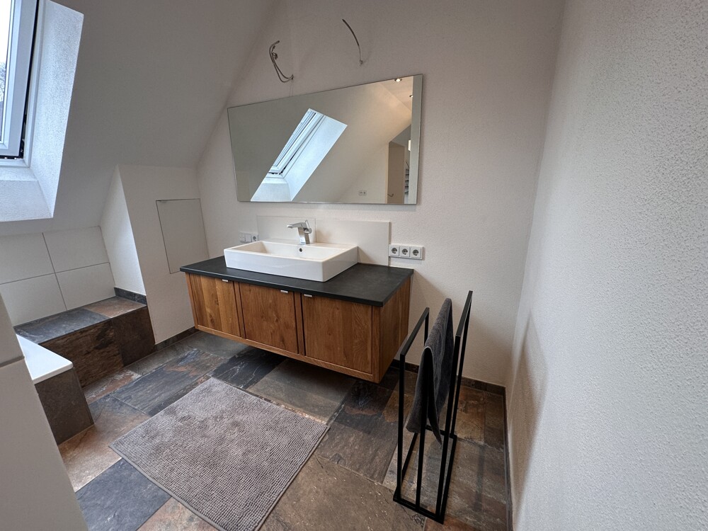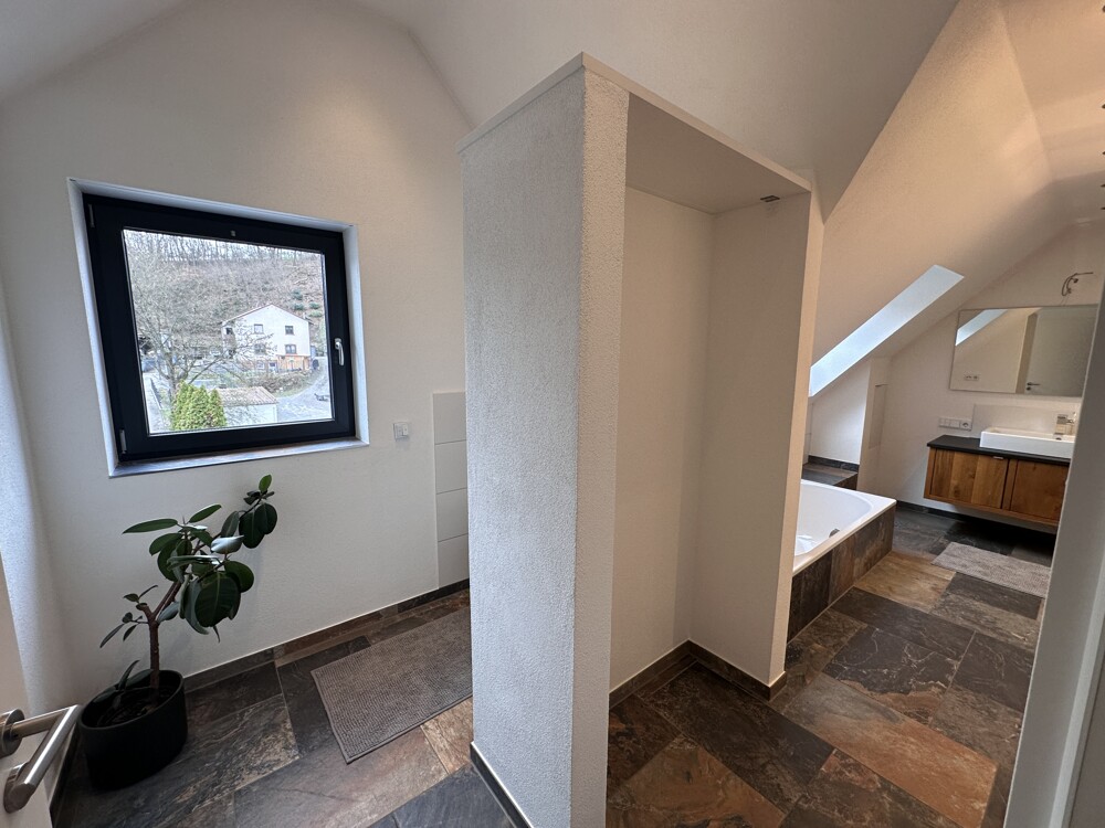 Im Ober- bzw. Dachgeschoss erwarten Sie ein großzügiges Elternschlafzimmer, zwei helle Kinderzimmer sowie ein stilvolles Badezimmer mit bodengleicher Dusche, Badewanne und hochwertiger Ausstattung. Auch energetisch überzeugt dieser Bereich, denn die Zellulosedämmung in Sparren und Zwischendecke, sowie die zusätzliche Aufdachdämmung sorgen für ein angenehmes Raumklima zu jeder Jahreszeit. Außerdem sind die Dachflächenfenster mit elektrischen Rollläden ausgestattet. Von dieser Etage besteht zudem ein Ausgang auf die noch fertigzustellende Dachterrasse (Belag und Brüstung fehlt).