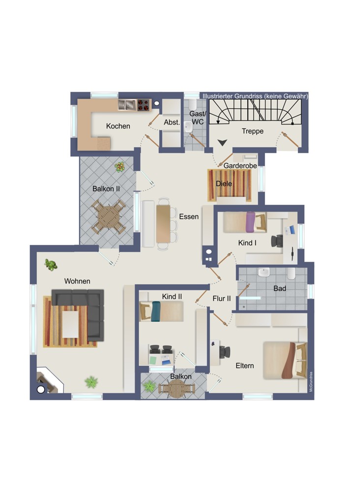 Auf ca. 120 m² Wohnfläche finden Sie ein großes Wohnzimmer, den offenen Essbereich, die Küche mit Abstellraum, ein Gäste-WC, zwei Kinderzimmer, ein Elternschlafzimmer, ein modernes Badezimmer sowie zwei Balkone. Auf beiden Balkonen genießen Sie einen herrlichen Ausblick ins Grüne.