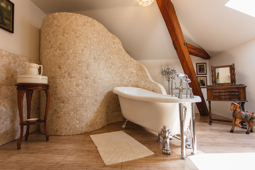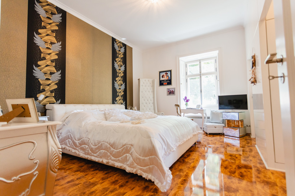 - Die Bodenbeläge sind zum Teil mit Marmor und Holz ausgelegt und werden vom Untergeschoss bis zum Dachgeschoss mit einer Fußbodenheizung erwärmt.