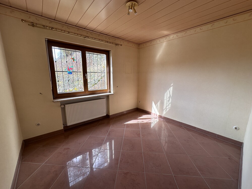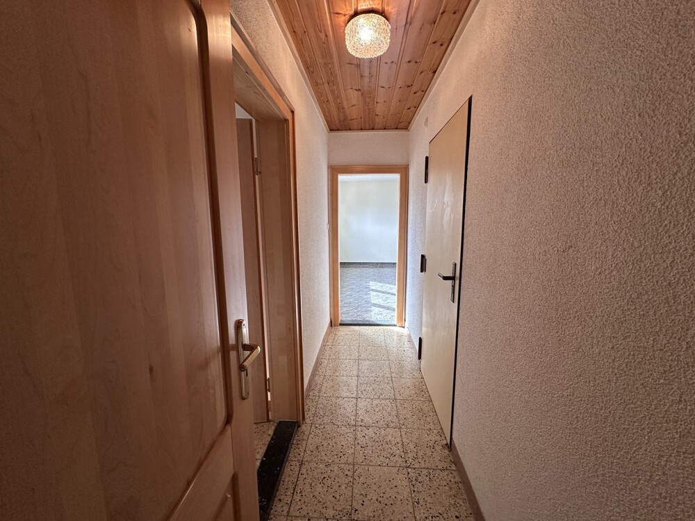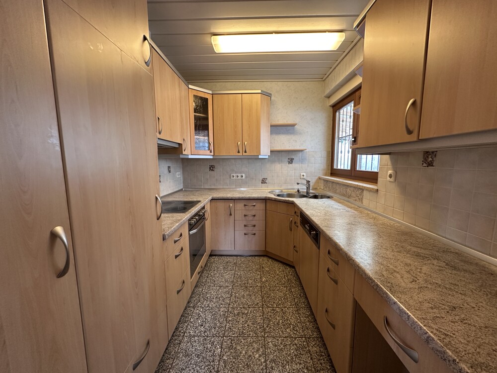 Die Küche grenzt an den Wohnbereich. Über den Flur gelangen Sie in das Eltern- und Kinderzimmer sowie in das modernisierte Bad (2000). Die Böden sind überwiegend gefliest (1990) und die Schlafräume mit Laminatboden ausgelegt.