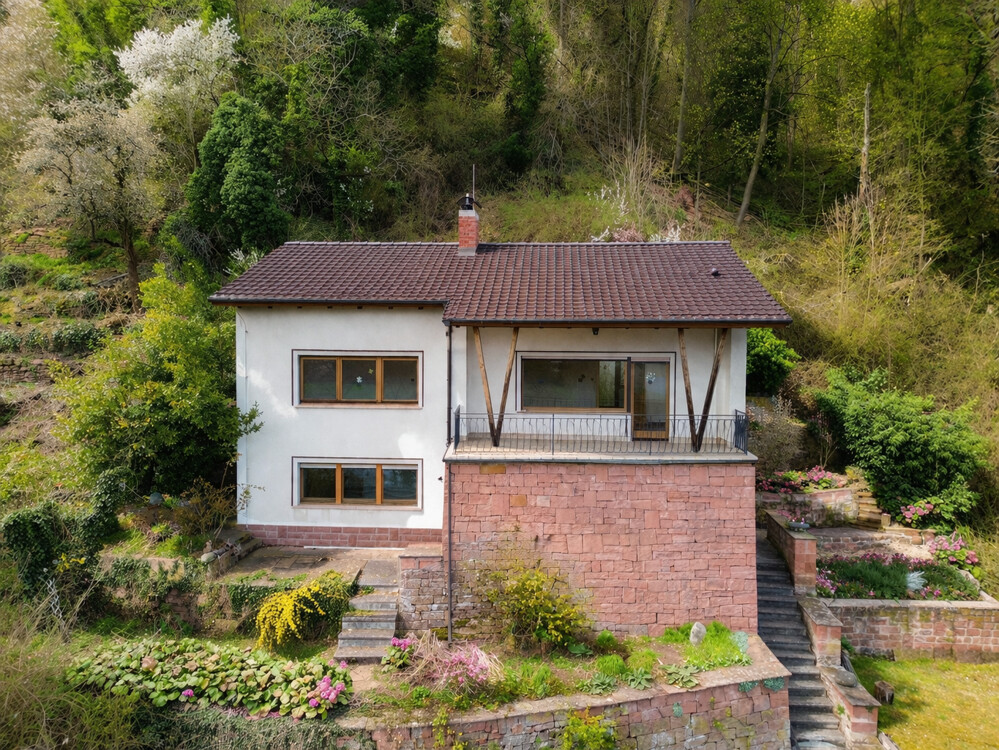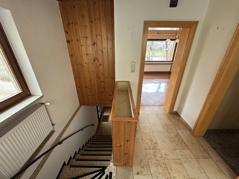 Das Einfamilienhaus wurde im Jahr 1961 in solider Bauweise errichtet und befindet sich auf einem Grundstück in Hanglage mit ca. 990 m². Die Immobilie bietet ideale Voraussetzungen für Familien, die ein Zuhause mit Platz und einem besonderen Blick auf den Main und das Tal suchen. Sie betreten das Haus im Untergeschoss und gelangen zunächst in das Treppenhaus, von dem aus Sie das Erdgeschoss erreichen.