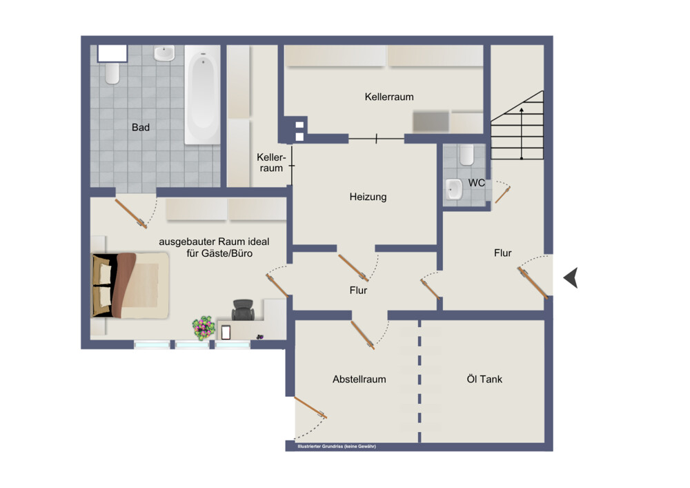 Darüber hinaus bietet das Untergeschoss weitere ca. 77 m² Nutzfläche. Diese umfasst einen Heizraum, einen Abstellraum mit Öltank, sowie zwei Kellerräume und bietet somit ausreichend Stauraum und vielfältige Nutzungsmöglichkeiten.