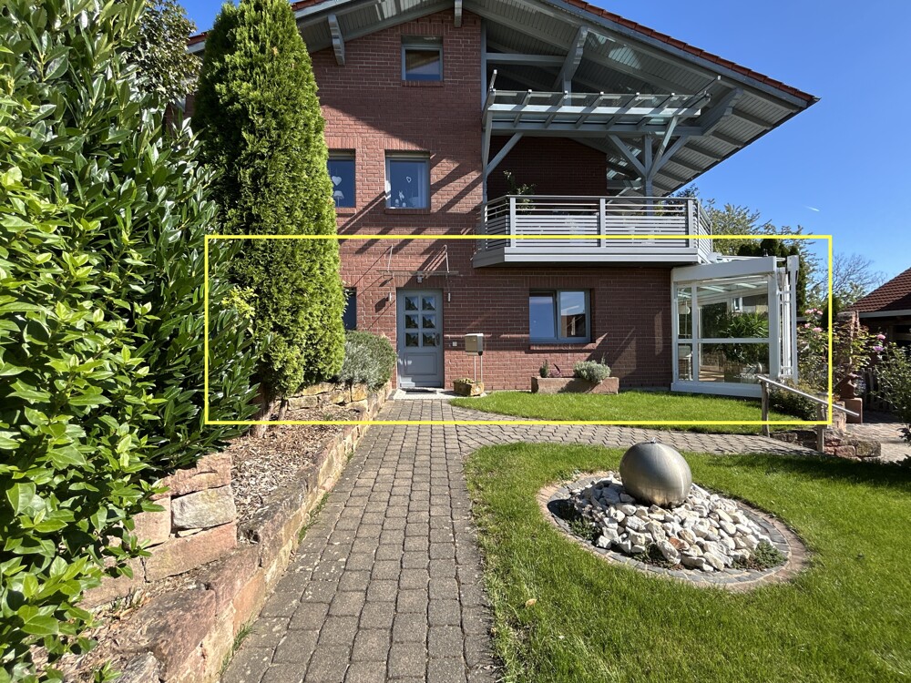 Der Zugang erfolgt über einen separaten Hauseingang, der ein hohes Maß an Privatsphäre bietet. Zur Wohnung gehören ein eigener Gartenanteil mit einem liebevoll gestalteten Pavillon sowie ein Stellplatz direkt am Haus.