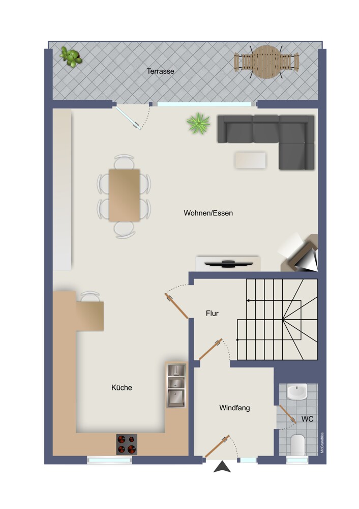 Das Reihenhaus verfügt über vier Etagen und bietet insgesamt ca. 121 m² Wohnfläche im Erd- , Ober- und Dachgeschoss.