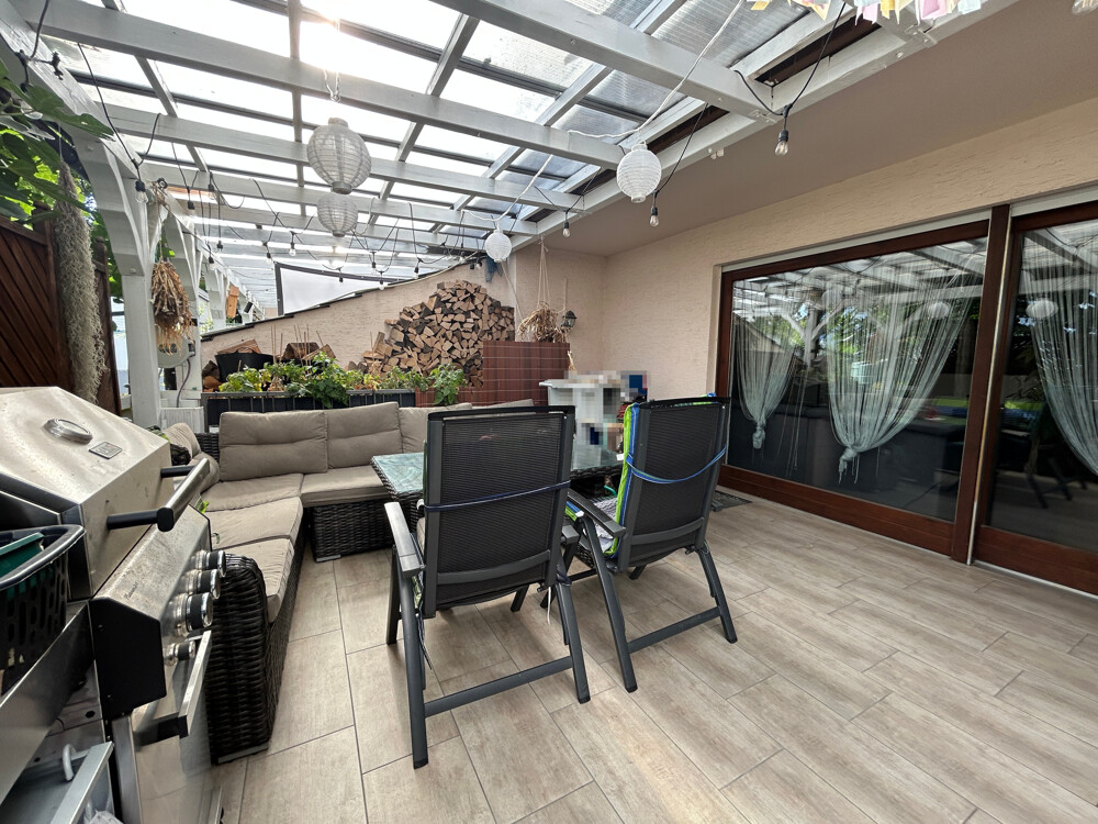 Die überdachte Terrasse bietet viel Platz für die ganze Familie. Der Garten schließt sich an.