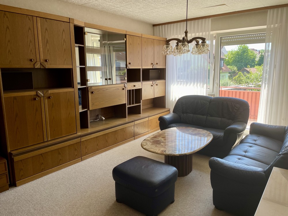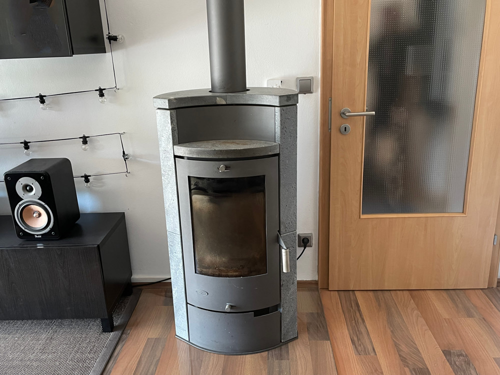 - Wohnzimmer mit Kachelofen und Ausgang auf den Balkon und in den Garten