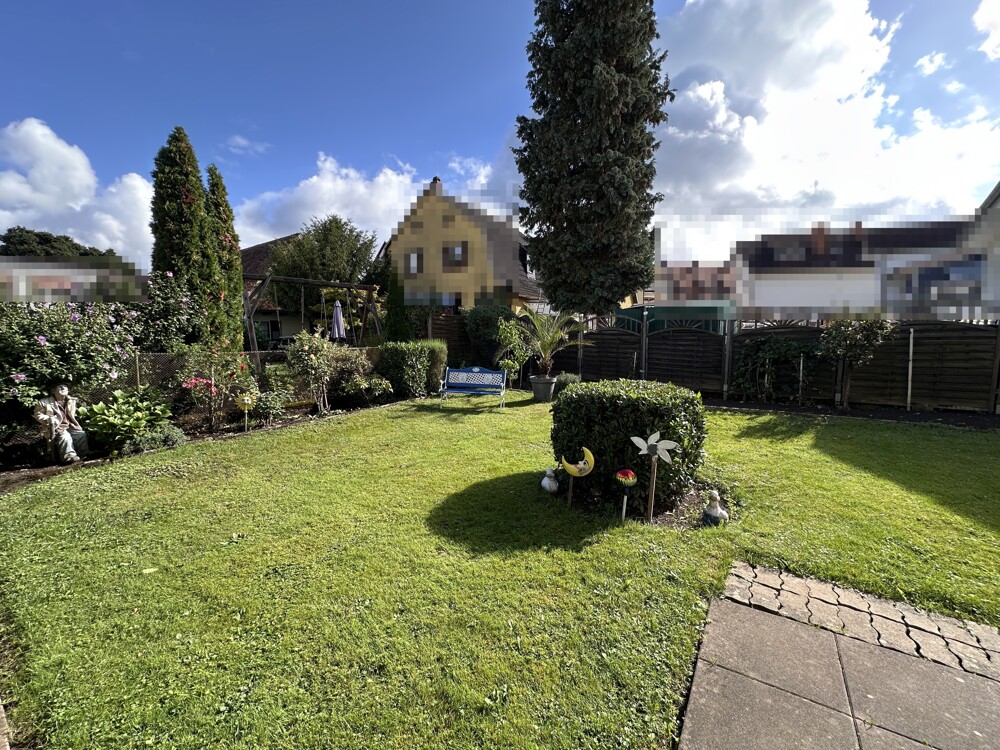 Das Grundstück mit ca. 486 m² ist fast ebenerdig. Der Garten bietet eine große Grünfläche zum Spielen für Kinder oder Erholung in ruhiger Waldrandlage. Auf dem Grundstück befindet sich eine Garage und rechts davon ein weiterer Stellplatz im Freien.