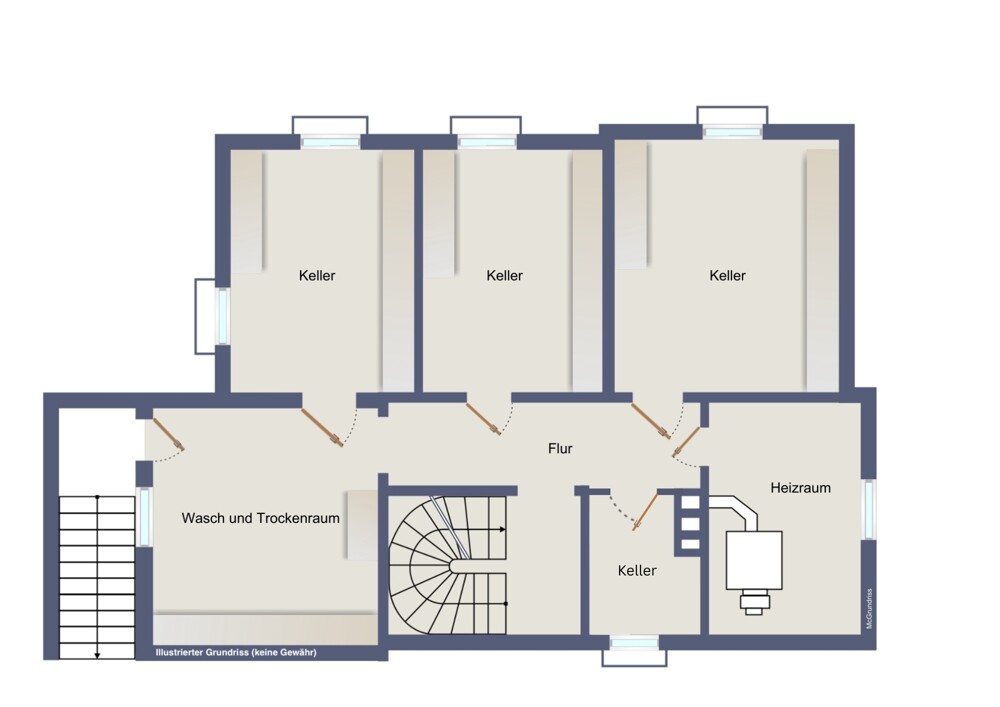Im Kellergeschoss befinden sich ein Flur, ein Wasch- und Trockenraum mit Kelleraußentreppe, drei weitere Kellerräume (davon einer als Partykeller), sowie ein Heizungsraum.