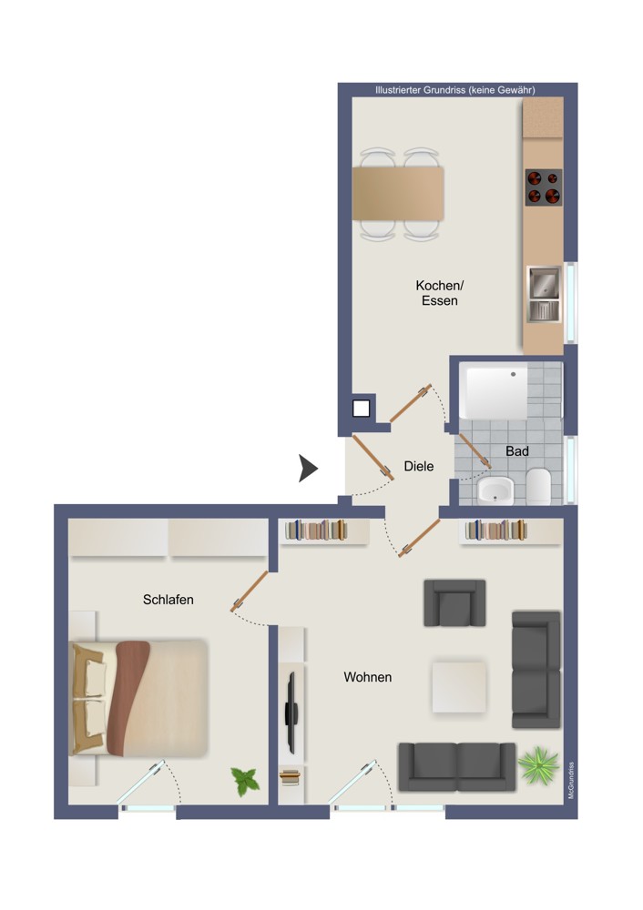 Die süße Wohnung bemisst eine Fläche von ca. 47 m² und bietet ein Wohnzimmer, eine Küche mit Essbereich, ein Schlafzimmer sowie ein modernes Badezimmer mit Dusche und WC. Die stilvolle Einbauküche mit Elektrogeräten (Kühl-/Gefrierschrank, Backofen, Mikrowelle, Herd und Spülmaschine ist im Mietpreis inbegriffen.
