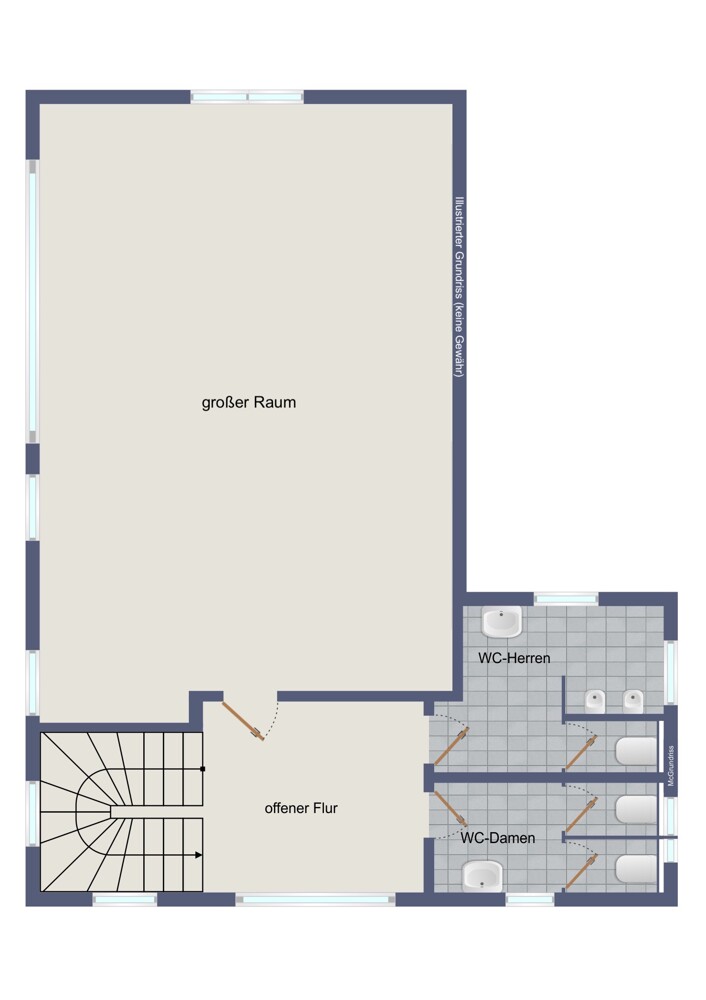 Die gesamte Gewerbefläche umfasst ca. 84 m² und verteilt sich auf den großen Hauptraum, einen offenen Flurbereich sowie separate Damen- und Herren-WCs.
