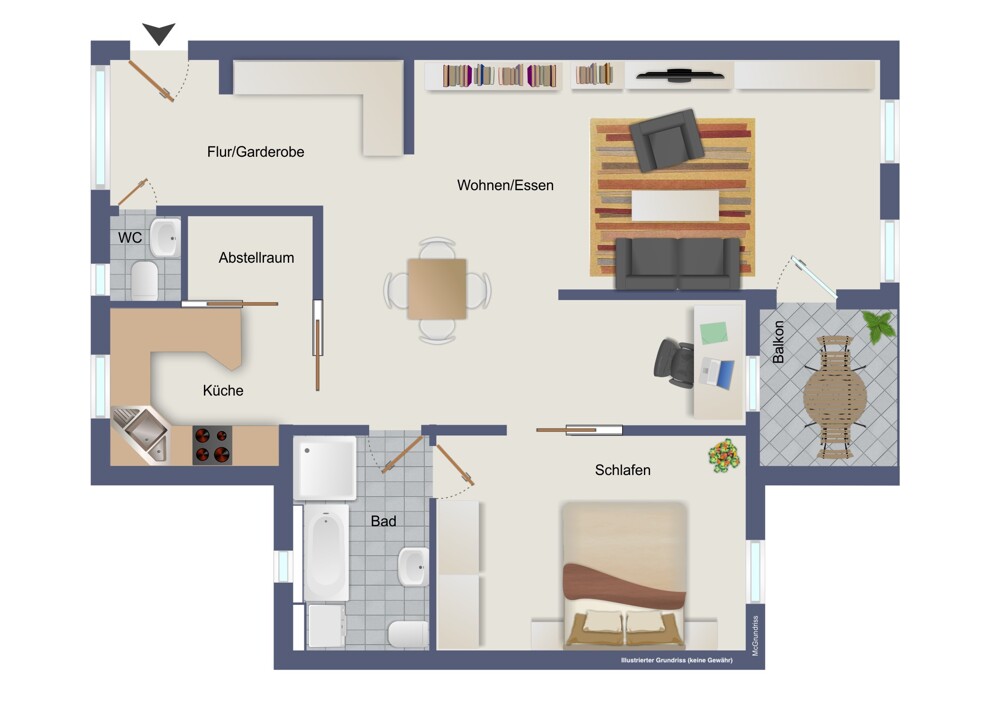 Die gut geschnittene Wohnung bietet ca. 91 m² Wohnfläche und überzeugt durch ihren offenen und durchdachten Grundriss. Sie verfügt über einen Wohn- und Essbereich mit Zugang auf den Balkon, eine Küche mit Abstellraum, eine kleine Büroecke, ein Schlafzimmer, ein Badezimmer mit Wanne, Dusche (nicht schwellenfrei) und WC sowie zusätzlich ein Gäste-WC. Die Böden sind mit hellen, modernen Fliesen ausgestattet und werden mit einer Fußbodenheizung erwärmt.