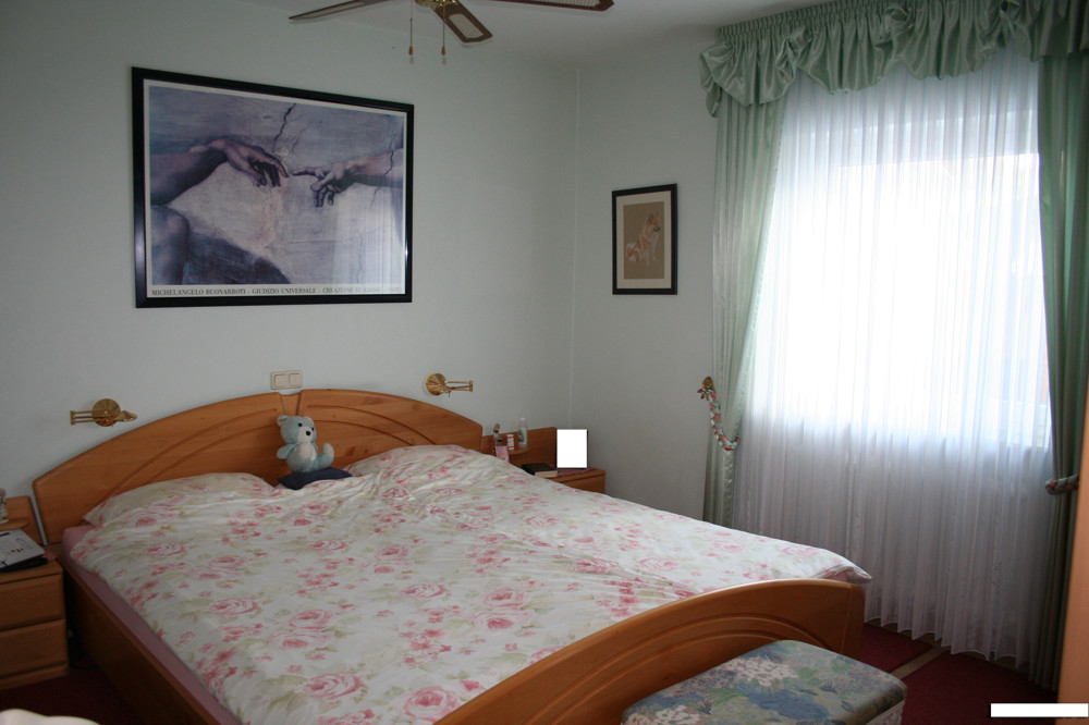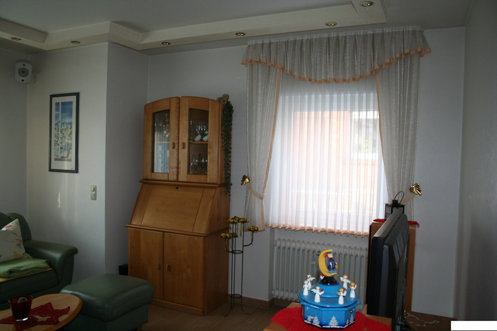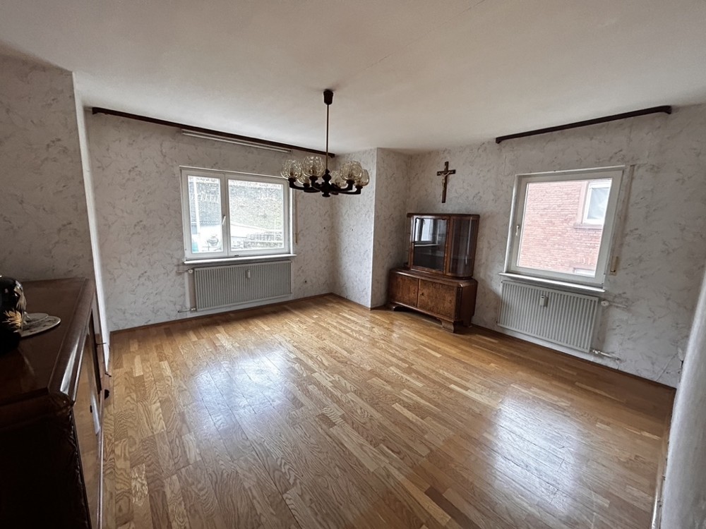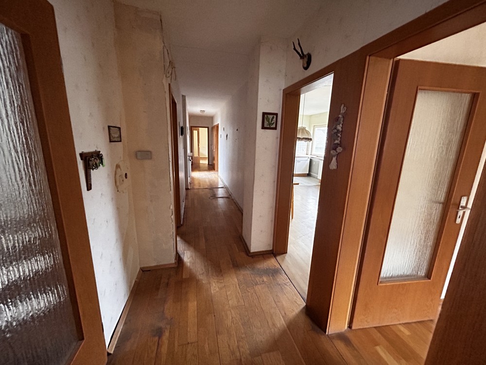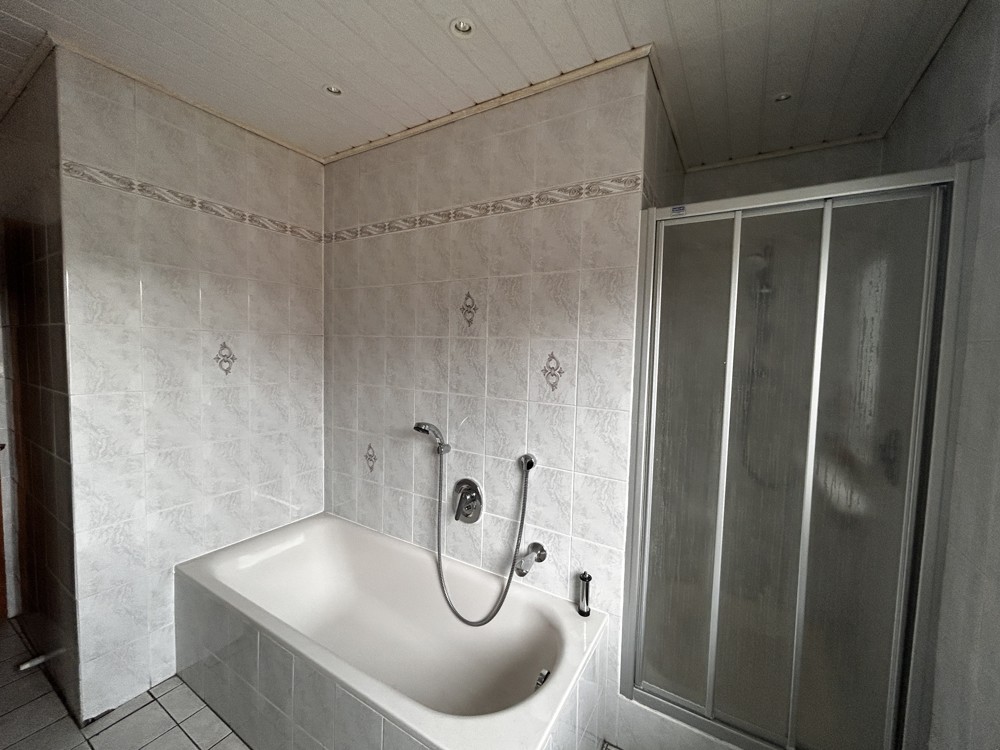 Die Wohnung im OG ist mit Holzfenstern ausgestattet. Die Böden sind unterschiedlich mit Fliesen und Laminat belegt. Es wurde bereits ein Heizkörper im Elternschlafzimmer ausgetauscht und das Badezimmer zeitgemäß modernisiert. Diese Wohnung befindet sich überwiegend in einem renovierungsbedürftigen Zustand.