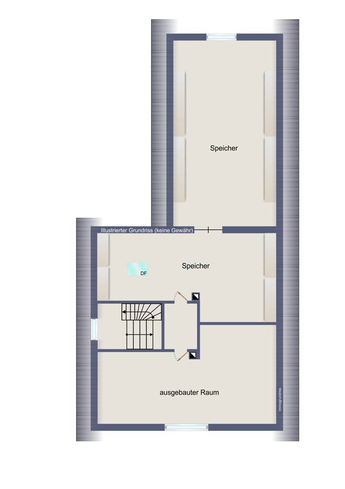 Im DG wurde in den 90er Jahren nachträglich ein Raum ausgebaut. Dieser ist mit einem Tageslichtfenster und einem Heizkörper ausgestattet. In diesem Raum wurden die Schrägen und der Boden gedämmt. Der restliche Teil des Dachgeschosses dient als Speicher bzw. Abstell-/Lagerfläche.