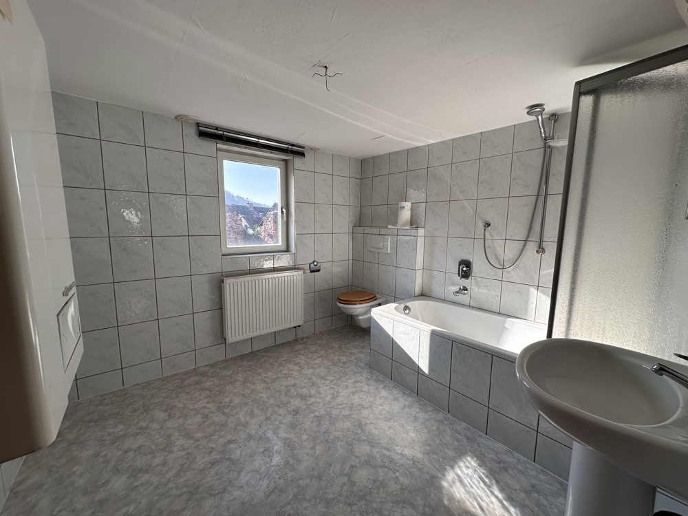 Das Obergeschoss beherbergt eine 3-Zimmerwohnung mit Wohnzimmer, zwei Schlafräumen, einer Wohnküche sowie einem hellen und gepflegten Badezimmer mit Wanne, Dusche und WC.